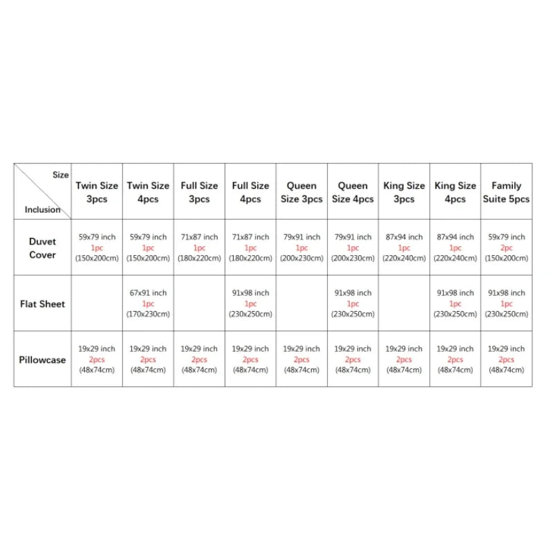 size_info: {"sizeInfoList":[{"length":{"cm":"48*74","inch":"18.90*29.13"},"size":"Twin Size 3pcs","vid":-1},{"length":{"cm":"48*74","inch":"18.90*29.13"},"size":"Twin Size 4pcs","vid":-2},{"length":{"cm":"48*74","inch":"18.90*29.13"},"size":"Full Size 3pcs","vid":-3},{"length":{"cm":"48*74","inch":"18.90*29.13"},"size":"Full Size 4pcs","vid":-4},{"length":{"cm":"48*74","inch":"18.90*29.13"},"size":"Queen Size 3pcs","vid":-5},{"length":{"cm":"48*74","inch":"18.90*29.13"},"size":"Queen Size 4pcs","vid":-6},{"length":{"cm":"48*74","inch":"18.90*29.13"},"size":"King Size 3pcs","vid":-7},{"length":{"cm":"48*74","inch":"18.90*29.13"},"size":"King Size 4pcs","vid":-8},{"length":{"cm":"48*74","inch":"18.90*29.13"},"size":"Family Suite 5pcs","vid":-9}]}